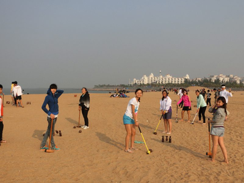 在海边进行沙滩木球竞赛交流