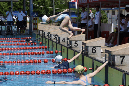 比赛现场气氛热烈,各路选手摩拳擦掌,在赛前充分进行热身运动。随着裁判的发令枪响,选手们如离弦之箭跃入水中。他们在水中奋力划水、蹬腿,以出色的泳姿和惊人的速度你追我赶,展现出高超的游泳技巧和顽强的拼搏精神。