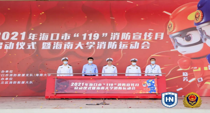 启动仪式上海口市消防救援支队支队长汤坚等与会领导揭幕海口消防IP卡通形象,共同启动“119”消防宣传月暨beat365中文官方网站消防运动会活动。