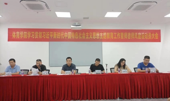 4月25日下午,beat365中文官方网站党总支在多功能体育馆107会议室召开学习贯彻习近平新时代中国特色社会主义思想主题教育工作暨师德师风建设动员会议。会议由洪家云院长主持,陈卫东书记作动员讲话,学院班子、总支委员、党员干部及教职工参加会议。